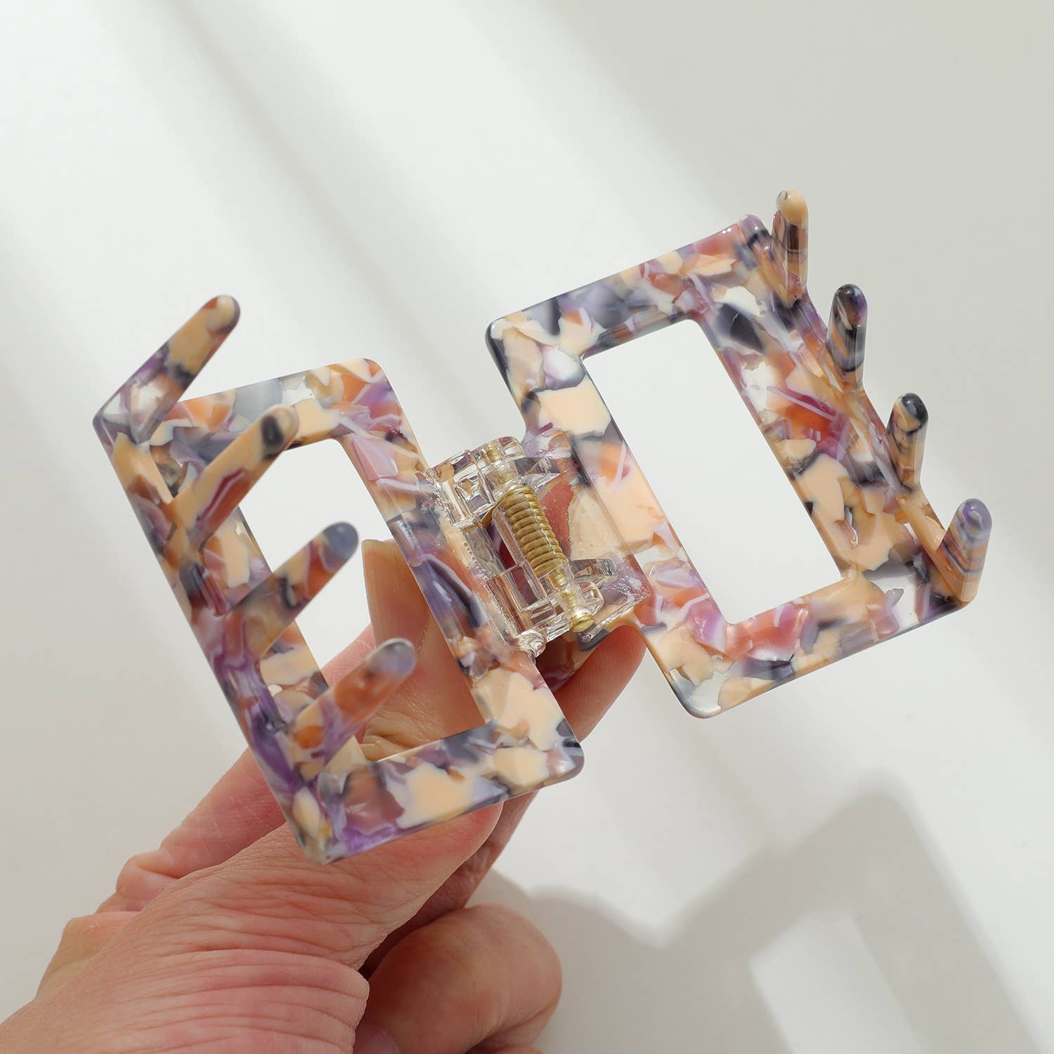 - Claw clip featuring a marbled purple, orange and cream color