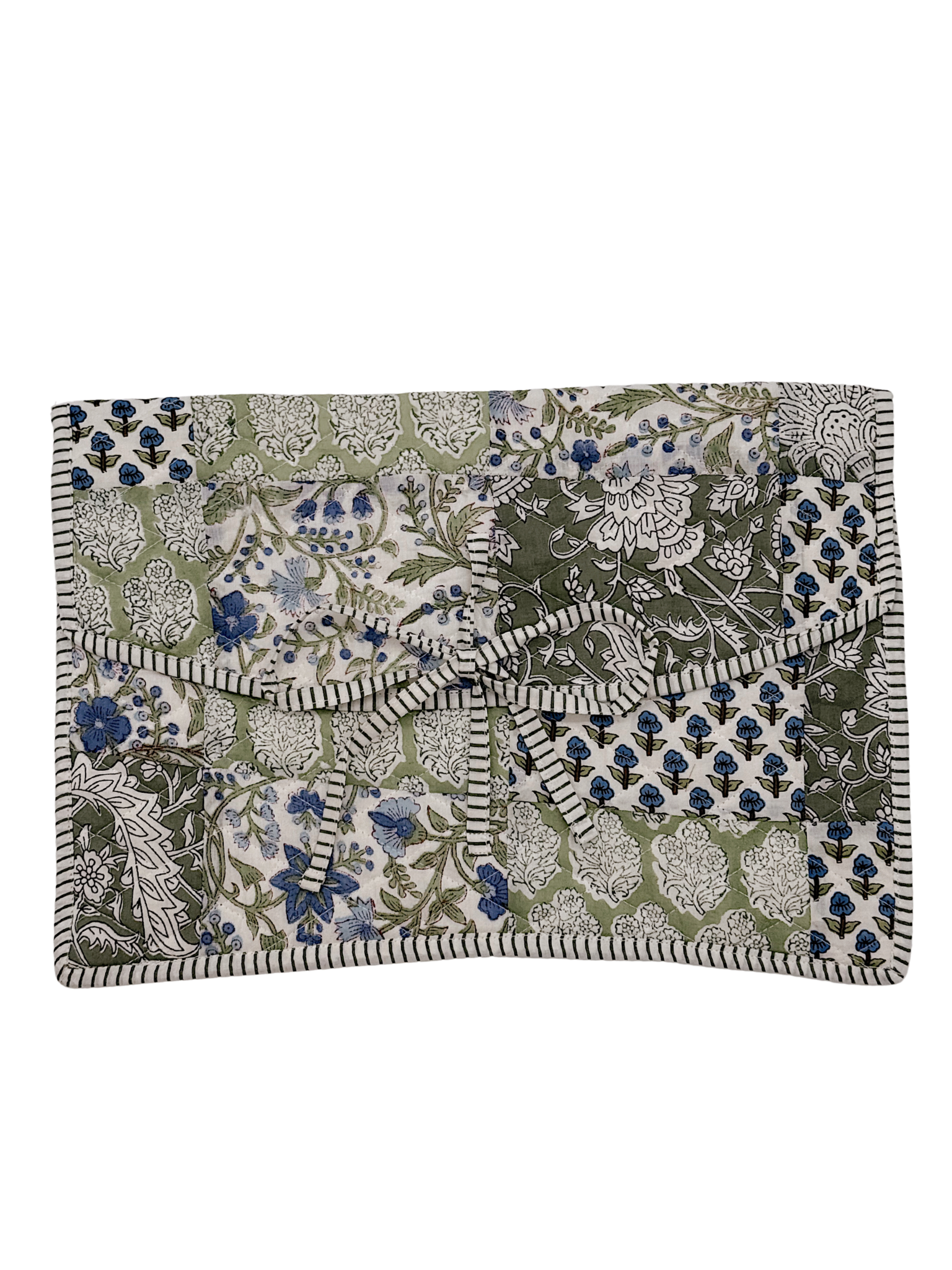 - Crafted from a blushing green floral block print, 100% cotton, stitched together with diamond quilted detailing and finished off with a bow tie detail